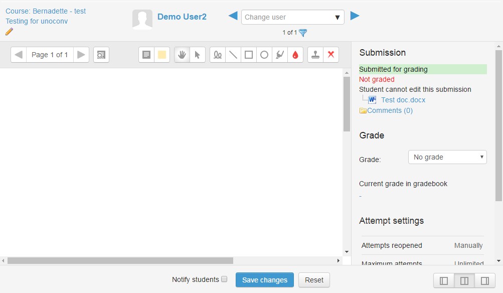- let teachers know that non-PDF files will not be converted, they will need to assess as they have in the past, and the page is NOT broken! (an example screenshot of what is seen when a .docx file is not converted to PDF is in the attached file. Note that if the grader clicks on the icons at the bottom right of the screen, the large file area can be removed.)