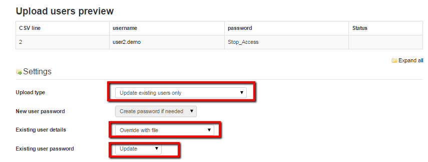 4. in Moodle, go to Administration> Users> Accounts> Upload users